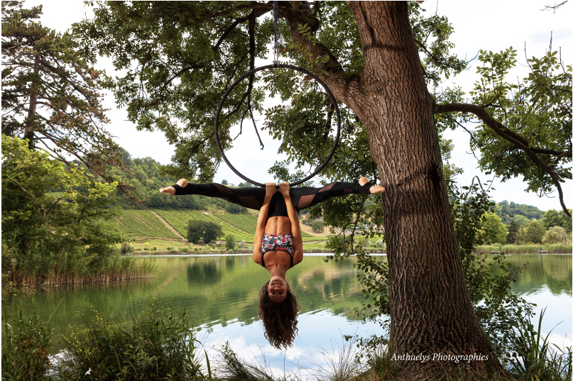 Du cerceau aérien, Figures acrobatiques dans un cerceau suspendu, alliant force et grâce.